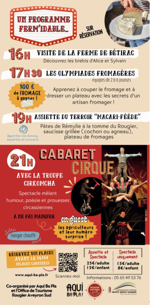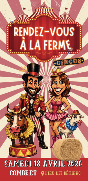 Après le succès des trois premières éditions des Rendez- vous à la ferme, le réseau de visites de fermes Aqui ba pla et l’Office de Tourisme Rougier Aveyron Sud proposent, le samedi 18 avril à 21h, à la ferme de Bétirac (chez Sylvain et Alice) sur notre commune, une grande soirée cabaret-cirque.