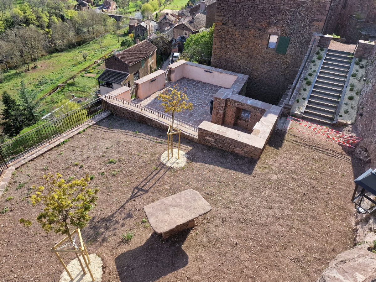 Aménagement des extérieurs de la nouvelle place du belvédère à Combret en haut du village : un engazonnement et plantations de divers massifs et arbres.