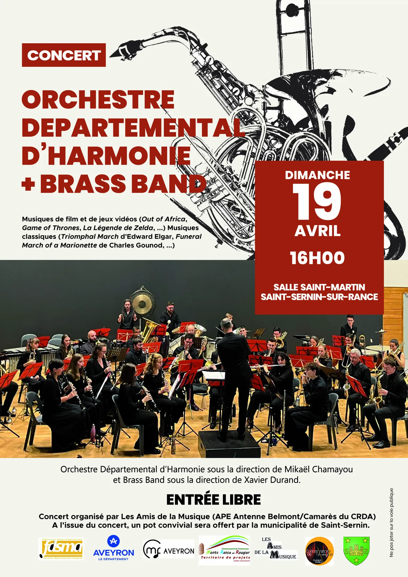Concert de l’Orchestre Départemental d’Harmonie sous la direction de Mikaël Chamayou et du Brass Band sous la direction de Xavier Durand .Organisé par les Amis de la Musique (APE Belmont/Camarès)