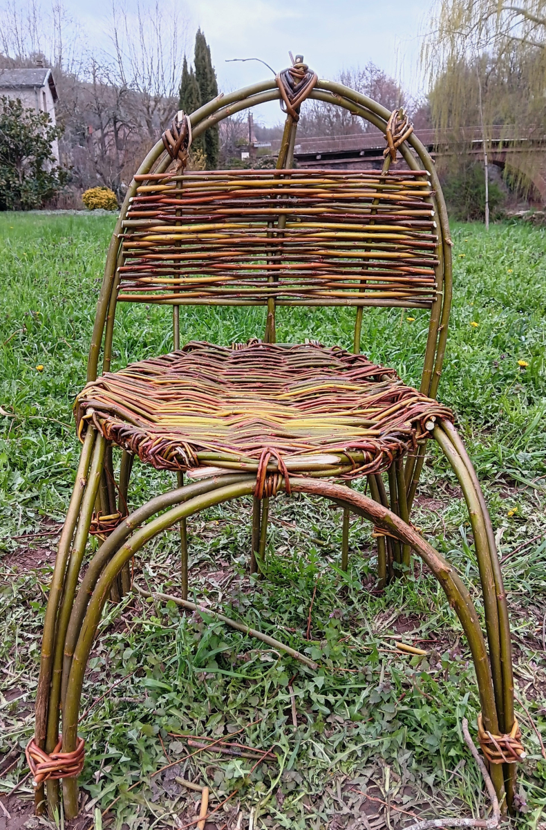 Élise Boidin, de l’association Ex Materia, y a réalisé puis installé une chaise un peu particulière : une chaise en osier vivant. Ses pieds, constitués de jeunes brins de saule, sont destinés à s’enraciner et à pousser librement au fil des saisons. Avec le temps, cette chaise pourrait bien changer de forme et s’intégrer naturellement dans le paysage, en attendant la prochaine récolte hivernale.